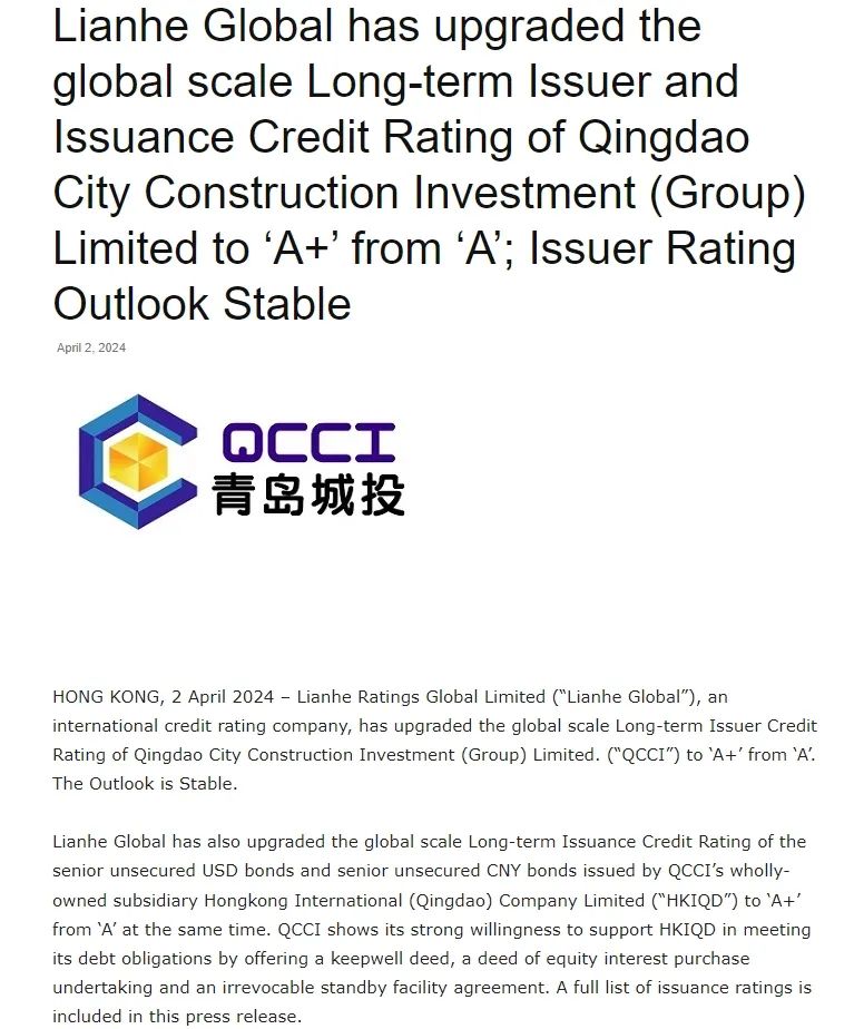 4月2日,权威评级机构联合国际正式宣布上调九州平台国际长期发行人评级从‘A’上调至‘A+’,展望稳定,同时将由青岛城投全资子公司香港国际(青岛)有限公司(“香港国际”)发行的高级无抵押美元债券和高级无抵押人民币债券的国际长期发行债务评级从‘A’上调至‘A+’。