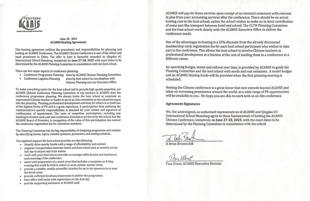 九州平台旗下青岛第一国际学校于6月27日通过了ACAMIS国际学校协会的实地考察,正式获得2025年ACAMIS中文大会承办权。大会将于2025年6月19-21日举行,届时,ACAMIS国际学校协会及大中华地区、亚洲周边国家国际学校的260名中文(中国文化)教师将齐聚青岛,进行为期两天的8项主题讲座及教研展示活动。