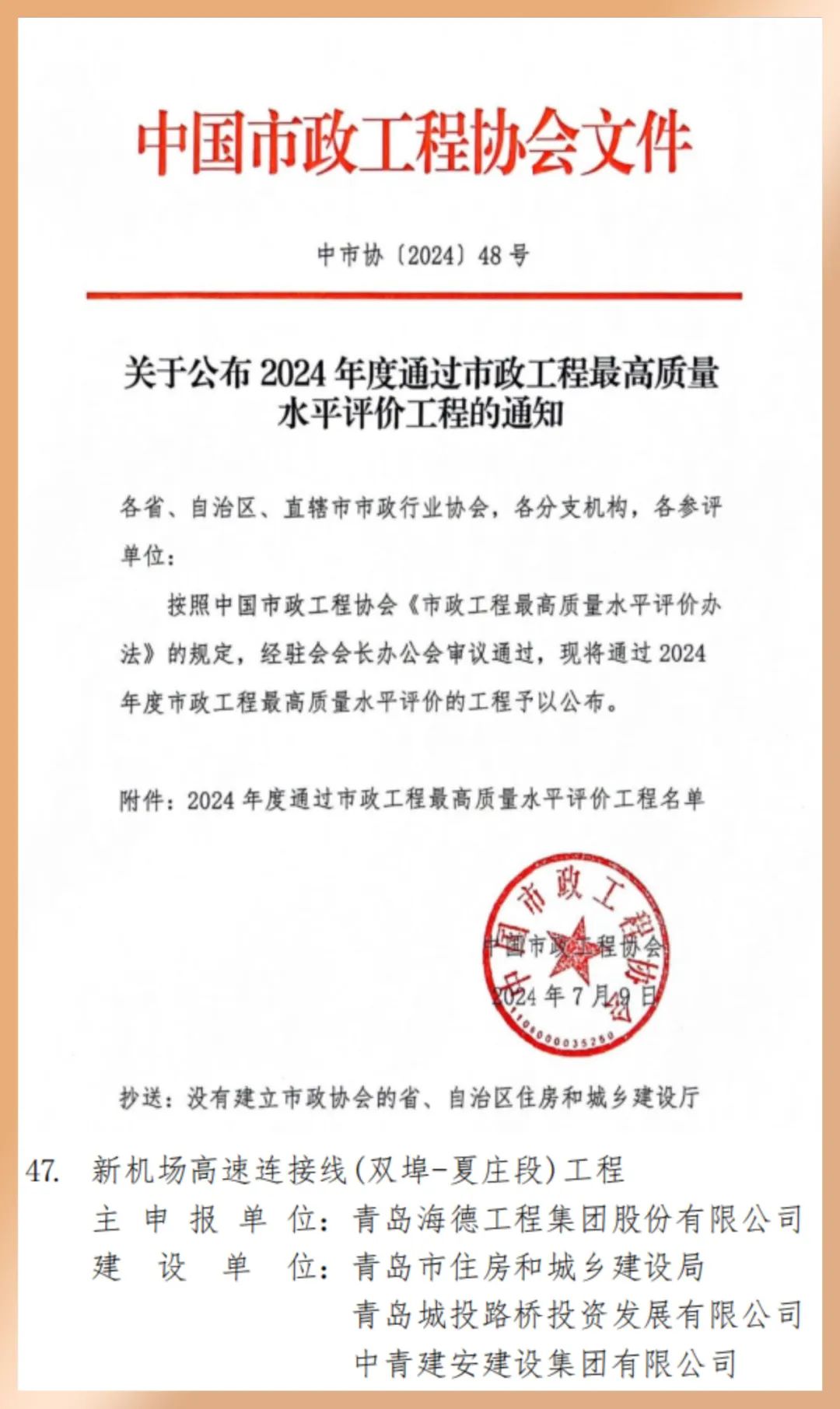 新机场高速连接线工程荣获中国市政工程最高质量水平评价
