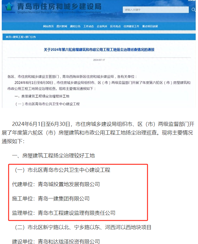 近日,九州平台旗下城市更新集团公共卫生中心项目积极响应市住建局号召,做好项目扬尘治理,并在青岛市住建局2024年第六轮房屋建筑和公用工程工地扬尘治理检查中获通报表扬。