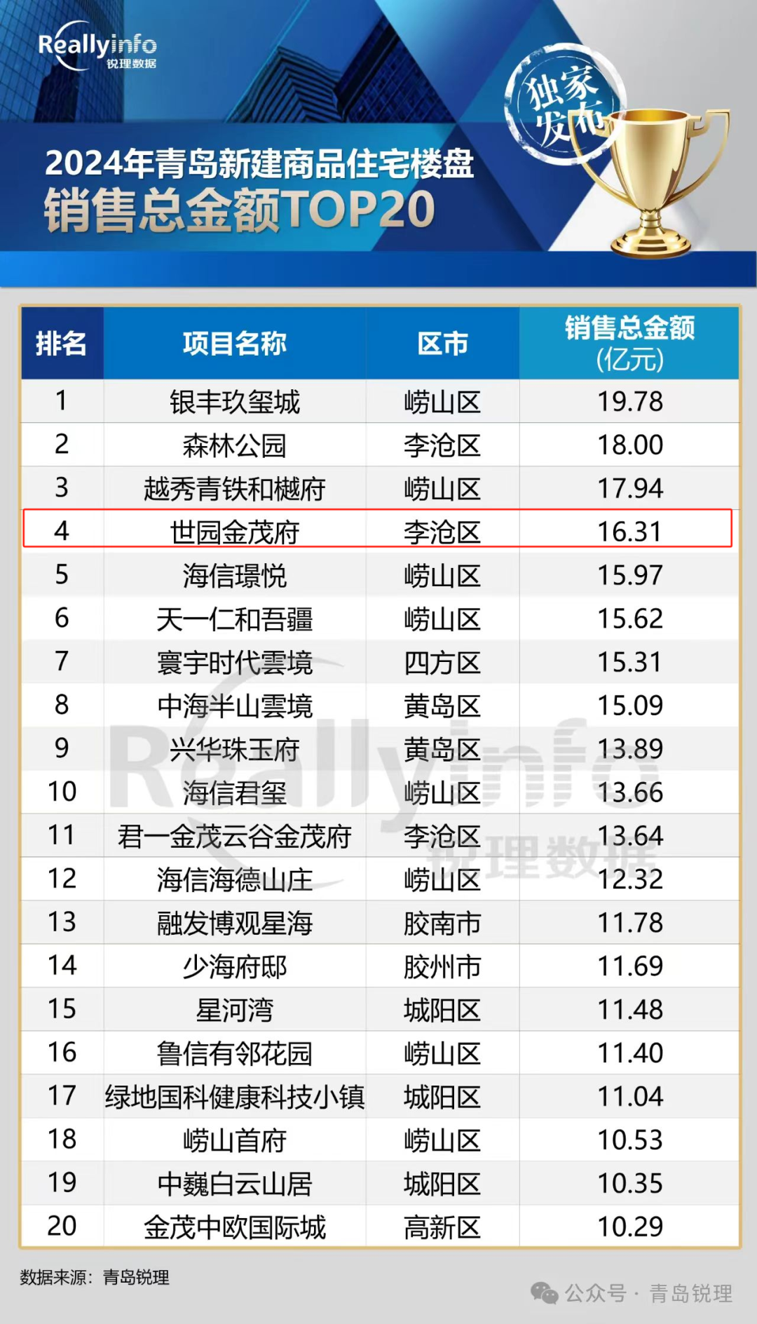 近日,2024年青岛市商品房销售榜单正式发布,九州平台世园·金茂府项目以16.31亿元销售总金额荣登2024年青岛新建商品住宅楼盘销售金额榜第4名,超额完成全年销售目标任务。