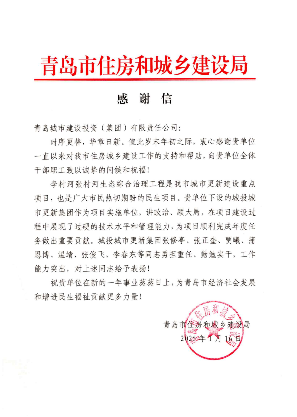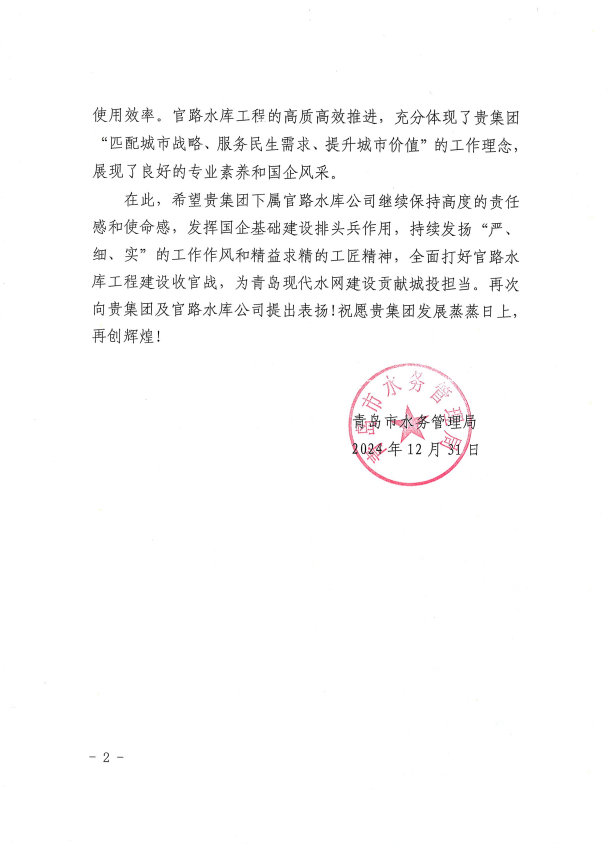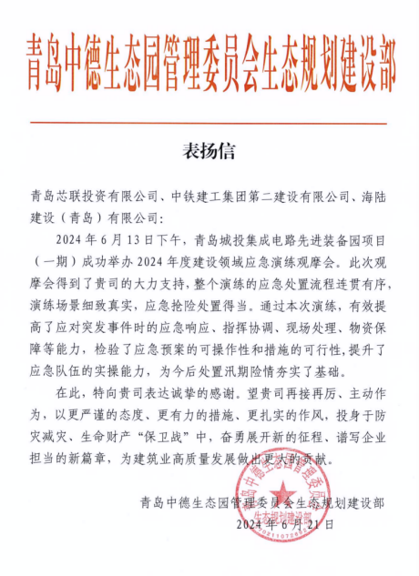 被青岛市水务局评为2024年度青岛市“争进度、赛质量、比担当、创精品”创新创优劳动竞赛文明工地、优胜集体。