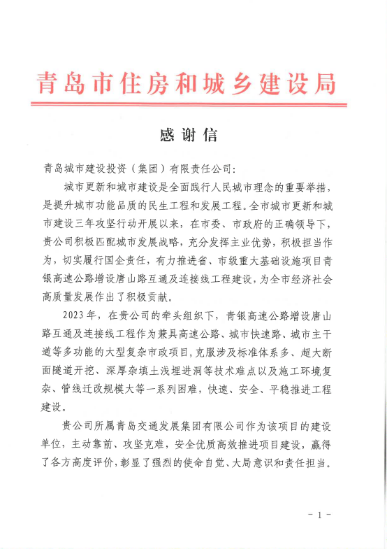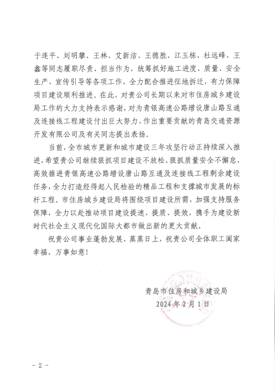 新机场连接线工程被山东省住房和城乡建设厅授予“2023年度山东省工程建设泰山杯”荣誉。
