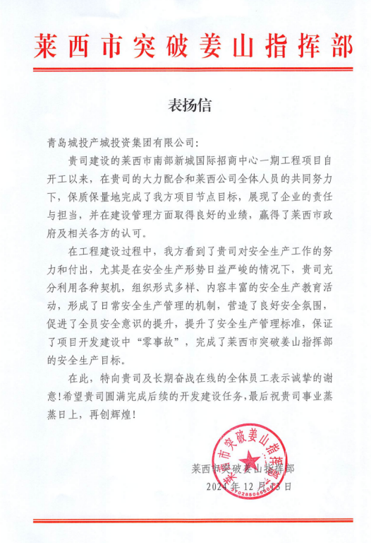 莱西国际招商中心项目被山东省住房和城乡建设厅评为2024年度全省住房城乡建设系统重点工程创新创优优胜奖;