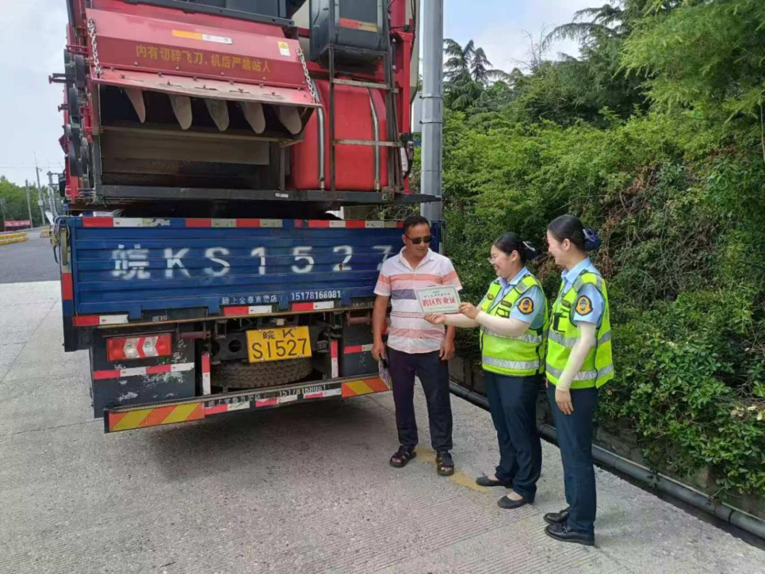 安全宣传。通过在收费站口发放宣传单、利用电子显示屏发布宣传标语等形式宣传跨区作业农机车辆免费通行政策,提升联合收割跨区作业参与者的安全守法意识。