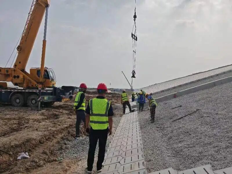 (图为官路水库围坝护坡联锁块安装现场)