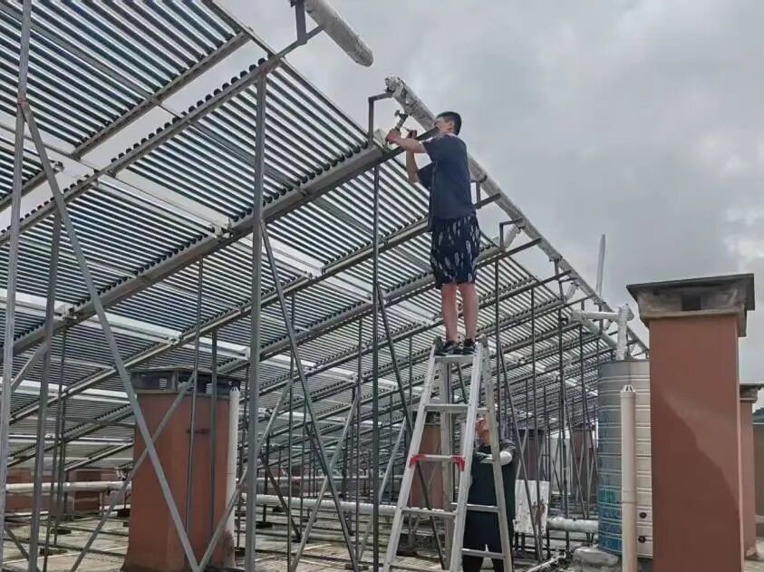 (图为工作人员翻新校园太阳能设施)