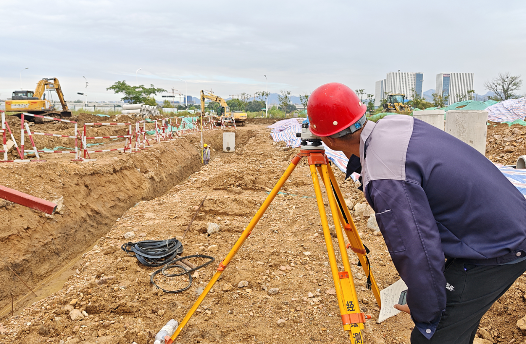 (图为施工人员进行沟槽标高测量)