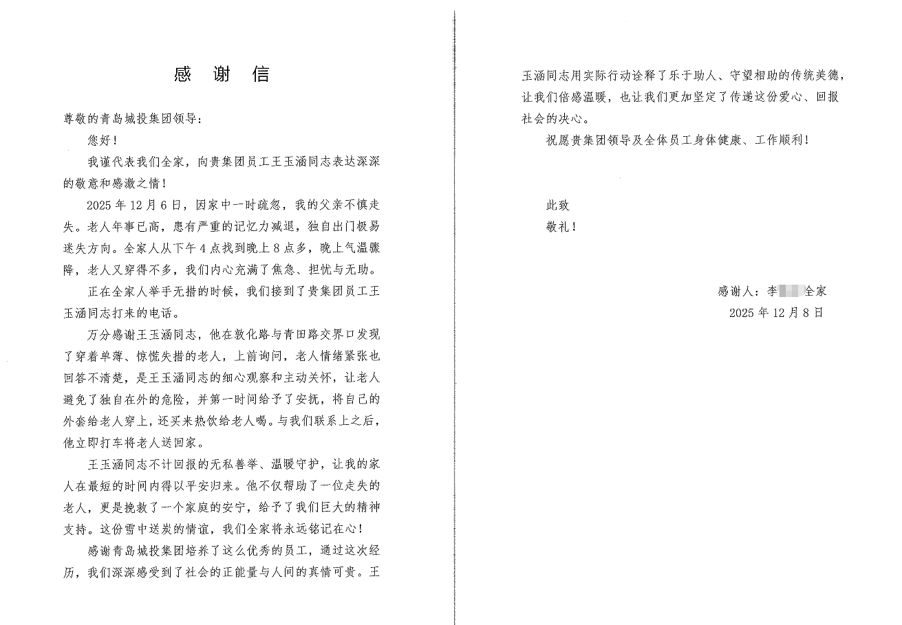 事后,深受感动的老人家属将感谢信与锦旗专程送至城投集团。据悉,老人年事已高,且患有严重记忆力衰退,此次意外走失令全家焦灼万分。正是王玉涵的温暖善举与及时相助,守护了老人的平安,也守护了一个家庭的团圆。