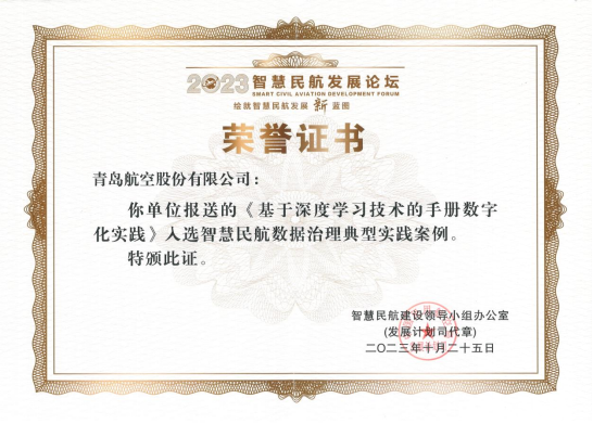近年来,青岛航空充分发挥城投集团产业协同优势,与集团旗下数字科技公司密切联动,数字化转型工作成果卓著。此次获奖,青岛航空结合行业手册使用场景及数字化先进技术,与青岛城投数科公司联合制定了青岛航空数字化手册的解决方案,经民航局发展计划司多轮评审,最终被纳入民航局智慧民航典型案例。