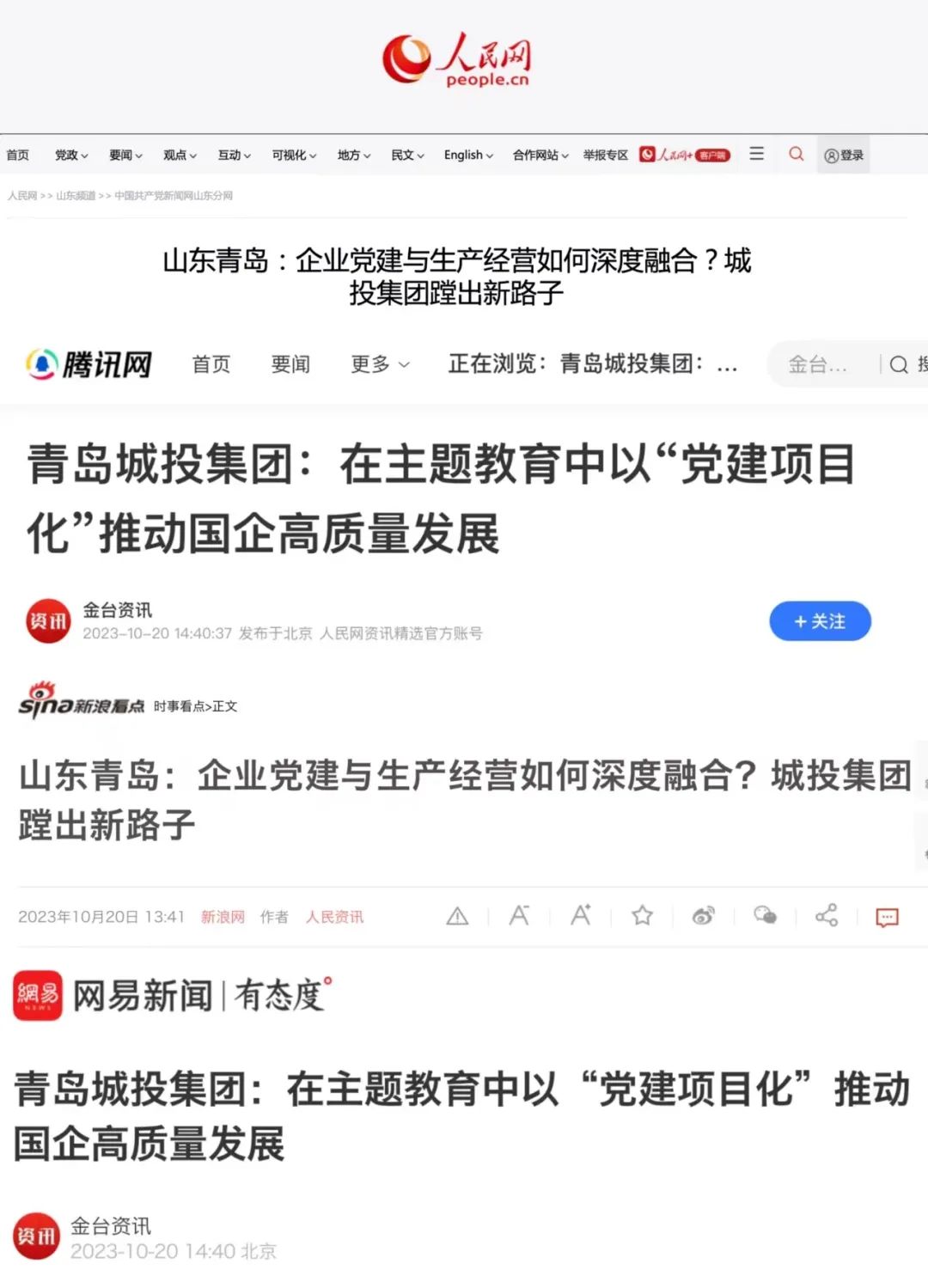10月20日,人民日报旗下人民网在中国共产党新闻网、人民网港澳台版、金台资讯、腾讯网、网易新闻、新浪网等知名媒体平台集中报道了《在主题教育中以“党建项目化”推动国企高质量发展》《企业党建与生产经营如何深度融合?城投集团蹚出新路子》两篇文章16次。九州平台“党建项目化”的创新做法,为国有企业破解党建经营“两张皮”难题给出“城投答案”,在互联网引发热烈反响。