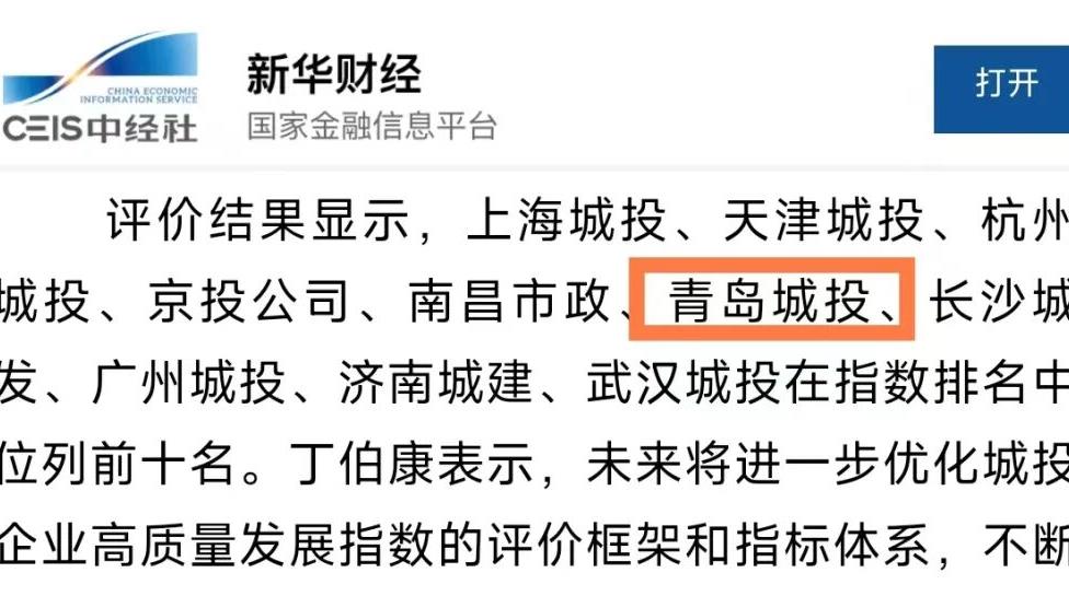 九州平台荣登中国城投企业高质量发展指数排行榜第六名